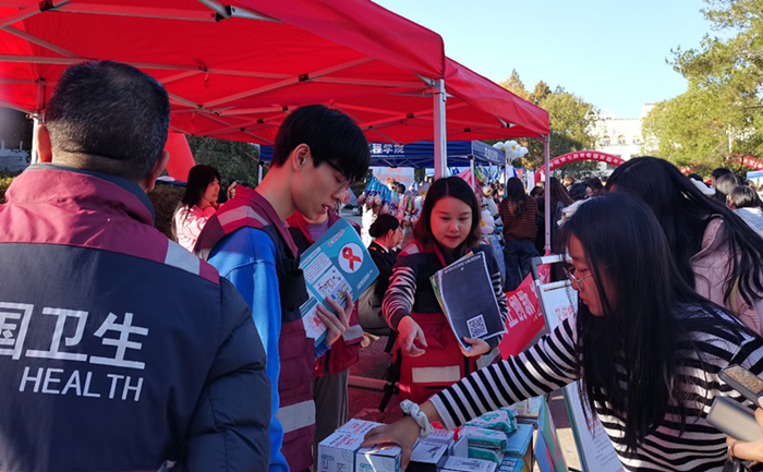 11月26日下午,校医院依托学校第八届健康成长服务月活动开幕式,于逸夫图书馆前开展传染病防控宣传。